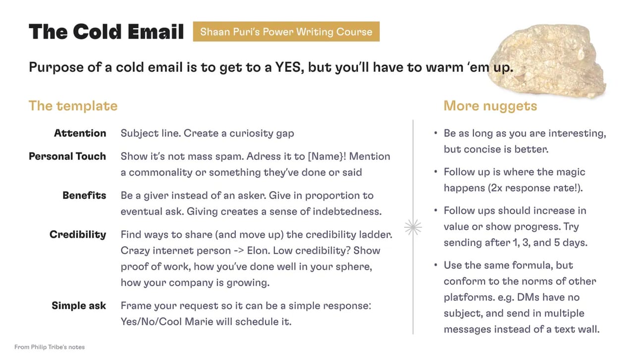 There are dozens of different cold email resources you can find on the internet — so I’ll simply leave you with this awesome graphic from Shaan Puri’s Power Writing course: