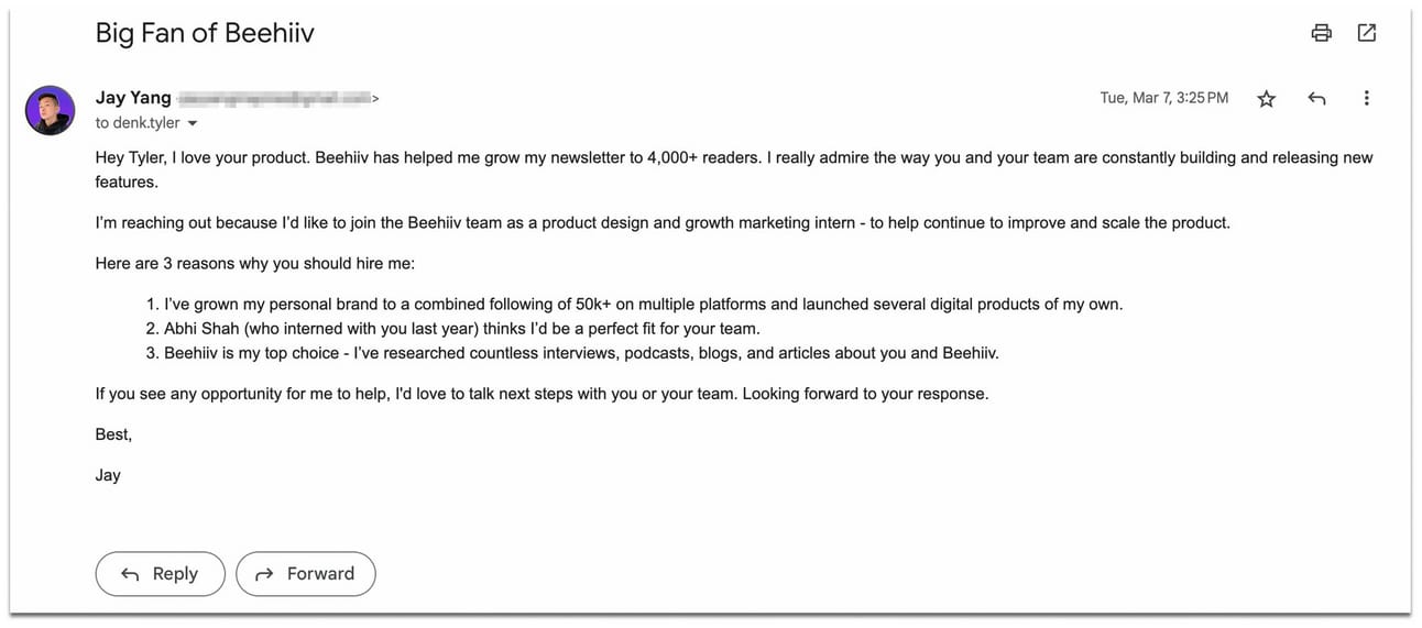 I was lucky to have connected with Abhi Shah — who interned with beehiiv last year — over Twitter.