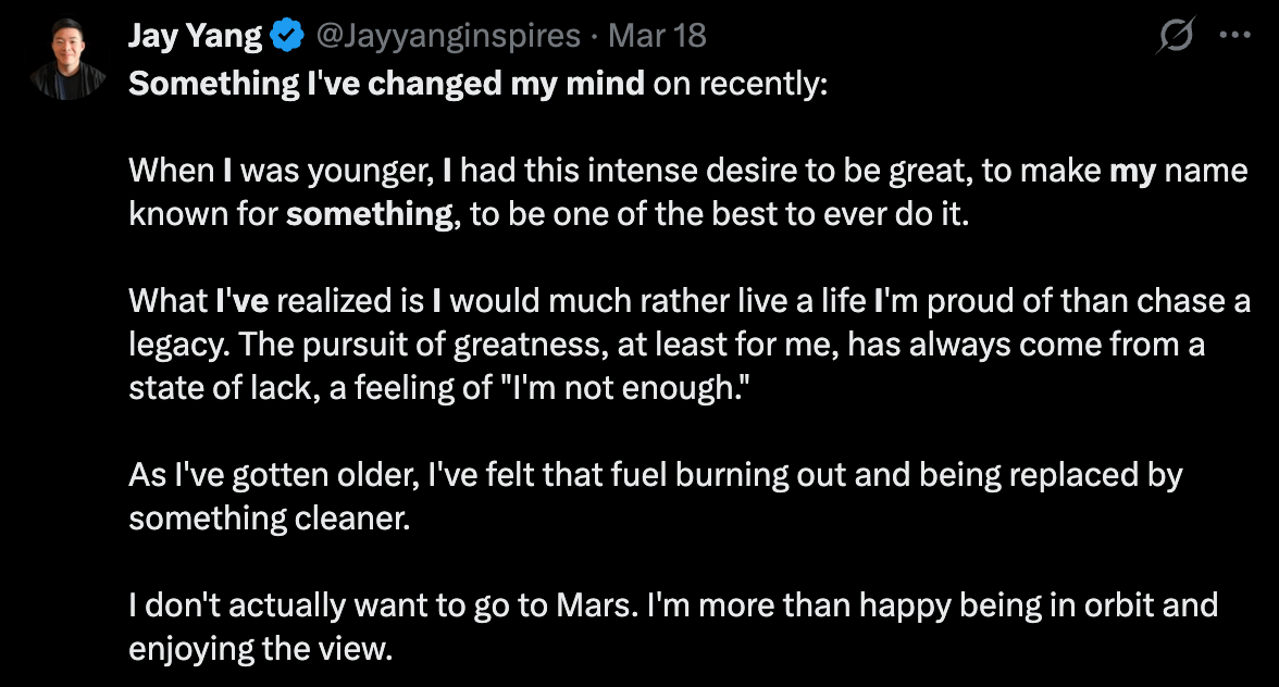 Call me soft, but I actually think it’s far more ambitious to define the limits of your ambition. Anyone can be reckless in their pursuit of more. It takes wisdom to realize when you’re sacrificing the war of life to win the battle of business.