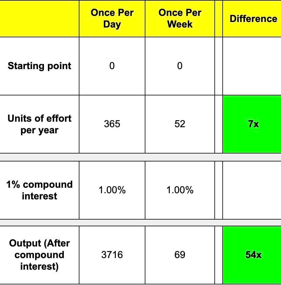 He said, “If you go from doing a task weekly to daily, you achieve 7 years of output in 1 year. If you apply a 1% compound interest each time, you achieve 54 years of output in 1 year.”